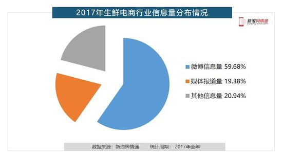 據(jù)新浪輿情通大數(shù)據(jù)分析顯示,2017年,生鮮電商整體網(wǎng)絡(luò)輿情傳播熱度指數(shù)5.42,全年相關(guān)輿情信息量197.14萬條,微博信息量和媒體報(bào)道量為主要信息來源,分別占比59.68%和19.38%。