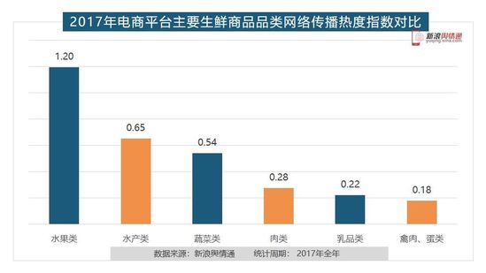 在電商平臺主要生鮮產(chǎn)品品類熱度方面,據(jù)新浪輿情通大數(shù)據(jù)分析顯示,2017年,水果類商品所受輿論關(guān)注較高,全年網(wǎng)絡(luò)輿情傳播熱度指數(shù)1.20,高于其他主要生鮮食品品類,水產(chǎn)類商品、蔬菜類商品、肉類商品、乳品類商品以及禽肉、蛋類商品全年熱度位列其后。