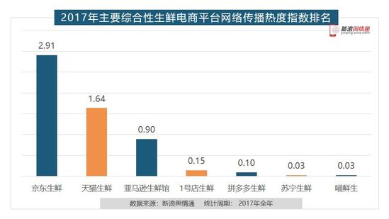 據(jù)《每日經(jīng)濟(jì)新聞》報(bào)道,天貓生鮮目前占據(jù)著我國生鮮電商市場超過80%的市場份額,但在2017年輿論關(guān)注度方面,京東生鮮卻更為搶鏡。據(jù)新浪輿情通大數(shù)據(jù)分析顯示,2017年,在主要生鮮電商平臺中,京東生鮮全年網(wǎng)絡(luò)輿情傳播熱度指數(shù)2.91,領(lǐng)跑其他生鮮電商平臺,天貓生鮮、盒馬鮮生、亞馬遜生鮮館、京東到家、美團(tuán)生鮮、永輝超級物種、易果生鮮、每日優(yōu)鮮、順豐優(yōu)選全年熱度緊隨其后。