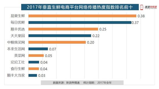 與綜合性生鮮電商不同,垂直生鮮電商一般會從生鮮產(chǎn)品源頭開始介入產(chǎn)業(yè)鏈的各個(gè)環(huán)節(jié),全程把控供應(yīng)鏈,保證商品品質(zhì)和用戶體驗(yàn)。在主要垂直生鮮電商平臺中,據(jù)新浪輿情通大數(shù)據(jù)分析顯示,2017年,易果生鮮、每日優(yōu)鮮、順豐優(yōu)選網(wǎng)絡(luò)傳播熱度指數(shù)排名前三位,天天果園、中糧我買網(wǎng)、本來生活網(wǎng)、美菜網(wǎng)、沱沱工社、食行生鮮、順豐大當(dāng)家熱度排名四到十位。