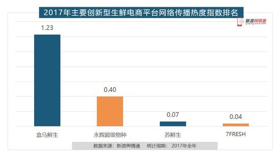 據(jù)新浪輿情通大數(shù)據(jù)分析顯示,在主要?jiǎng)?chuàng)新型生鮮電商平臺中,2017年盒馬鮮生所受輿論關(guān)注明顯高于其他平臺,全年網(wǎng)絡(luò)傳播熱度指數(shù)1.23,媒體報(bào)道量7.59萬條,永輝超級物種、蘇鮮生、7FRESH所受輿論關(guān)注緊隨其后。