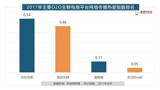 O2O生鮮電商則通過與便利店或超市的合作,進(jìn)行生鮮產(chǎn)品的銷售,配送范圍一般不超過5公里,可在2小時(shí)內(nèi)送達(dá),能夠滿足用戶的及時(shí)性需求。在主要O2O生鮮電商平臺中,據(jù)新浪輿情通大數(shù)據(jù)分析顯示,2017年,京東到家、美團(tuán)生鮮所受輿論關(guān)注較高,愛鮮蜂、多點(diǎn)Dmall熱度排名位列其后。