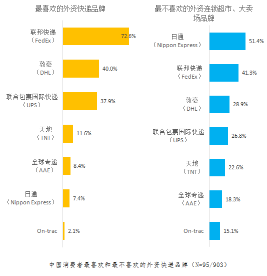 2017年的調(diào)查顯示,受訪(fǎng)者最喜歡的外資快遞是聯(lián)邦快遞,提及率為72.6%,排名第二的則是敦豪快遞,提及率為40.0%。